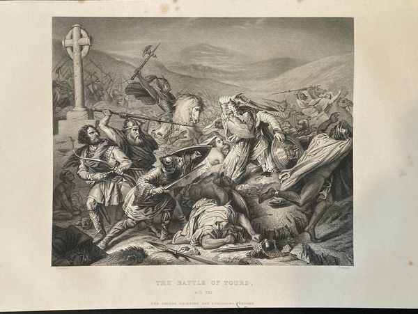 Also known as Bataille de Poitiers, this iconic illustration depicts Charles Martel (in mount) facing Abdul Rahman Al Ghafiqi (on right) in this epic battle won by Martel and his Frankish forces over the Umayyad Caliphilate. Al Ghafiqi was killed in the bloody conflict. This 1855 publication is by The London Printing and Publishing Company.