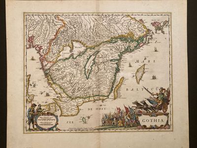 This very interesting circa 1635 map is by Johannes Janssonius or Jan Janson. The Northeastern part of the map starts in current day Oslo, Norway and ends in current day Northern Uppsala, Sweden. The map observes Copenhagen and other parts of Denmark residing around the scale cartouche. There is a litany of islands and archipelagos including Gotland, Oland and Aland that dot the Skagerrak, Kattegat and Baltic sea. In the center of the map are the two largest lakes in Sweden. Lake Vanern and Lake Vattern, Vanern being the larger. These lakes are not only striking but they helped strike the boundaries of Westro Gothia, Oostro Gothia, and Smalandia making up Gotaland as noted on the map in their Latin form as is the text on the verso. Gotaland or the land of Geats or Goths ,depending on the time frame, is reflective of the Germanic people settling there since the beginning of A.C.E. Most of what is known about the Goths of Sweden is by folklore and outsider accounts due to the lack of local text up until about the 13th century. Probably the most accurate depiction of the people in this area lies in the "Gutasaga". It is a single manuscript regarding the history of Gotland prior to it's Christianization circa 1350. The only copy survives at the National Library of Sweden along with the Gutalag, a Swedish law book that originated around 1220 A.C.E. that contains the Gutasaga. This historical map was published one year after Sweden's first adopted constitution in 1634 know as the Instrument of Government which challenged the Monarchy. This strife bears witness in the incredibly decorative title cartouche.