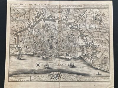 This large 1729 edition map of the city of Antwerp was published by Isaac van der Kloot with cartography by Abraham Deur in The Hague. Originally Engraved by Antoine Coquart and first published in 1708 by Gaspard Baillieul, the map shows the River Scheldt in the foreground with sailing ships and an arrow signifying the direction of the river's current to the North Sea. To the right is the Kasteel van Antwerpen, a pentagonal fort built between 1567 and 1572 by engineer Francesco Paciotto commissioned by the Duke of Alva. The Citadelle was partially destroyed in the "Sack of Antwerp" in 1576 and was reconstructed after the "Fall of Antwerp" in 1585 by Phillip V through a sixteen year upgrade not only to the Citadelle but also the fortifications represented by the larger outline on the map. The map shows Saint Michaels Abbey where the incomparable Abraham Ortelius lies. There is an index in French at the top right that has an itinerary of numbers, names and dates that directly correlate to numbered areas on the map beginning in 1200 AD. The index on the bottom right is the announcements of the French index in Dutch. Because Antwerp has been a major port of Europe over the last eight hundred years, there is such an abundance of very historic churches, buildings and wharfs on this map that one could revisit it for years and discover something new each time. A truly intriguing and historic map.