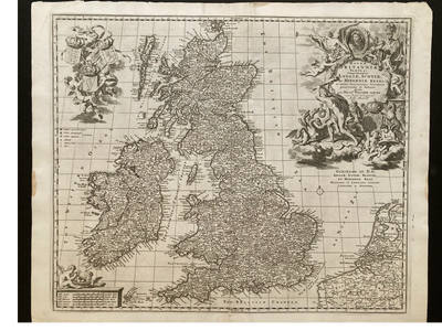 This decorative 1694 map of Britain, Scotland, Wales, Ireland and the coast of the Netherlands is by Nicolas Visscher II. He was part of a multi-generational family- run business in Amsterdam that spanned over 150 years starting with his great grandfather, Nicolas Joannis Visscher or Claes Jansz Visscher (1550-1612). Claes the First produced what are now very rare engravings such as VAN DE VELDE the four seasons and the panoramic View Of London before the fire as well as 17th Century Dutch landscapes. Cleas the Second (1587-1662), with his father's knowledge and teachings scaled the business immensely. Although a leading draughtsman, engraver, mapmaker and publisher of his time, it was also the Golden Age. The outdated and mundane Catholic Church was met with the explosive appeal of Martin Luther and his Ninety Five Thesis nailed to its front doors. The Reformation was in full fledge cognition and the Visschers would be one of the major beneficiaries of the campaign. The son of Claes the Second is Nicolas Visscher I (1618-1709) . He became a master at mapmaking at his time with works like "Novi Belgii Novaeque Angliae nec non partis Virginae tabula, Orbis Terrarum Nova et Accuratissima Tabula, and Novissima et Accuratissima Totius Americae". Today they are very sought after maps for their history, quality and rarity. Lastly, Nicolas Visscher II (1649-1702) who made this eclat map. He preferred his name Nicolaus. Back then there were many aliases. His Grandfathers also went by the name Piscatore. Cartographers were rock stars of their time for bringing to life, for the general public with access to publications, what explorers discovered beyond general knowledge of what the world was and the possibilities of what was out there. This map was part of his Atlas Minor.