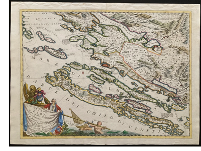 This topographically-lush and historically important map is by Vincenzo Maria Coronelli (1650-1718). He was born in the Republic of Venice. This map was published standalone in 1680 and It was also published in his atlas " Isolario Dell Atlante Venito" (1696). It is representative of the Zara region of what was Dalmatia at the time. The diagonal layout on the map seems to mimic the actual parallels which also provides more space for terrestrial and maritime borders. Along with his style, it creates a sweeping whimsical visual effect - a truly genius piece of work.