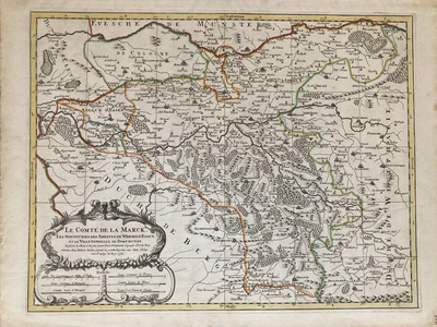 This 1696 map details the Ruhrgebeit region of western Germany which is now referred to the as the Ruhr Valley, an urban area in North Rhine Westphalia, Germany. Once a county of the Roman Empire it lays on both sides of the Ruhr and Lenne Rivers. Although this map was published by Chez Hubert Jaillot the original engraving was created by Nicolas Sanson as part of his "Atlas Nouveau". Sanson is considered the father of French cartography (1600-1667). Jaillot (1632-1712) published numerous works of his contemporaries as well as his own and most notably his "Atlas Francois" which was a compilation of a number of Sanson's maps. The word Westphalia, although a sect from the ancient Saxons Westfalen, it is most identified from The Treaty of Westphalia marking the end of the Thirty Years War, one the most destructive connected series of wars in the history of Europe beginning in 1618.