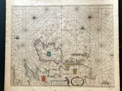 This magnificent sea chart of Ireland was published by Pieter Goos in 1666. It also has parts of England and Scotland. It was initially published earlier by Frederick de Wit in 1656. This map was a culmination of mapmakers such as Claes Visscher, William Jansson Bleau and Anthonie Jacobsz with Anthonie's son Theunis Jacobsz ultimately owning the plate. A fairly substantial cast indeed. Goos bought the plate from Anthonie Jacobsz and used it in his "Dee Zee Atlas ofte Water Weerland" which has been proposed as one of the acute sea atlases of its time. The map was part of Anthonie's "De Lichtende Columne ofte Zeespiegel" 1644-1650 atlases.