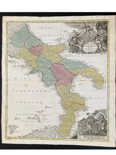 The This beautiful and very detailed 1716 map is by Johann Baptiste Homann. The map encompasses the Southern half of Italy from Terracina to the Adriatic Sea to the South including Northern Sicily. The Aeolian or Lipari Islands are featured North of Sicily which include current day Lipari, Vulcano, Panarea, Salina, Alicudi, Filicudi and Stromboli which have the same volcanic beginnings. The map shows also the Trimiti Islands off the coast of Puglia and Gargano Peninsula, a very history rich archipelago.